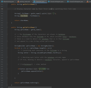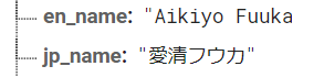 The idea I had to achieve this was simple in theory, but actually implementing it was a little difficult. Basically, the string for the Japanese name consisted of two different writing systems of the Japanese language: kanji and katakana. The family names of each character is usually in kanji 愛清 (Aikiyo), while the given name is in katakana フウカ (Fuuka). Since I only need the given name, all I needed to do was find a way to detect only katakana characters from the retrieved string of her full name.