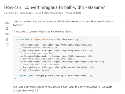 Anyway, back on topic. I wanted to allow hiragana inputs to also match the character's names that were in katakana. And for that, I consulted my good friend Google. After some extensive research, I found a source code done by someone to do just that which essentially "converts" a hiragana string into a katakana string through a bunch of unicode manipulation. To be honest, I don't fully understand how the conversion works myself, since unicode is something that's relatively new to me.