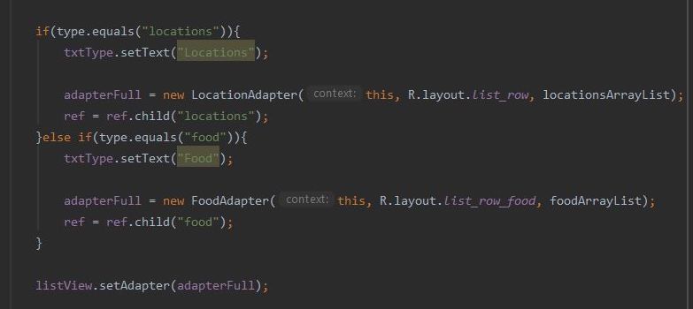 Here, we check for the value of variable "type", and depending on whether it points to "locations" or "food", 3 lines of code will execute; setting the text for the txtType TextView, setting the CustomAdapter for the respective ArrayLists, and setting the proper reference point in the database.