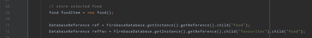 Next comes creating the two DatabaseReference points; one for the food table, and the other for the food table in favourites.