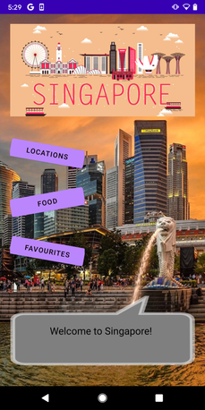 The background was attached to the LinearLayout used in the .xml file, along with ImageViews for the "Singapore" banner and textbox at the bottom for the merlion. In the middle, we have three buttons: Locations, Food and Favourites, each leading to their respective pages.