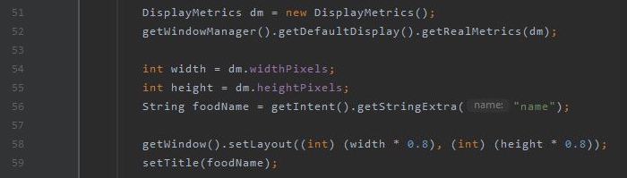 For this, along with some help from a tutorial on YouTube, I used DisplayMetrics to set the sizing of the screen to about 80% of the user's device. I also retrieved the "name" extra from the previous screen's intent, which points to the name of the food, which I then used to set the title of the screen.